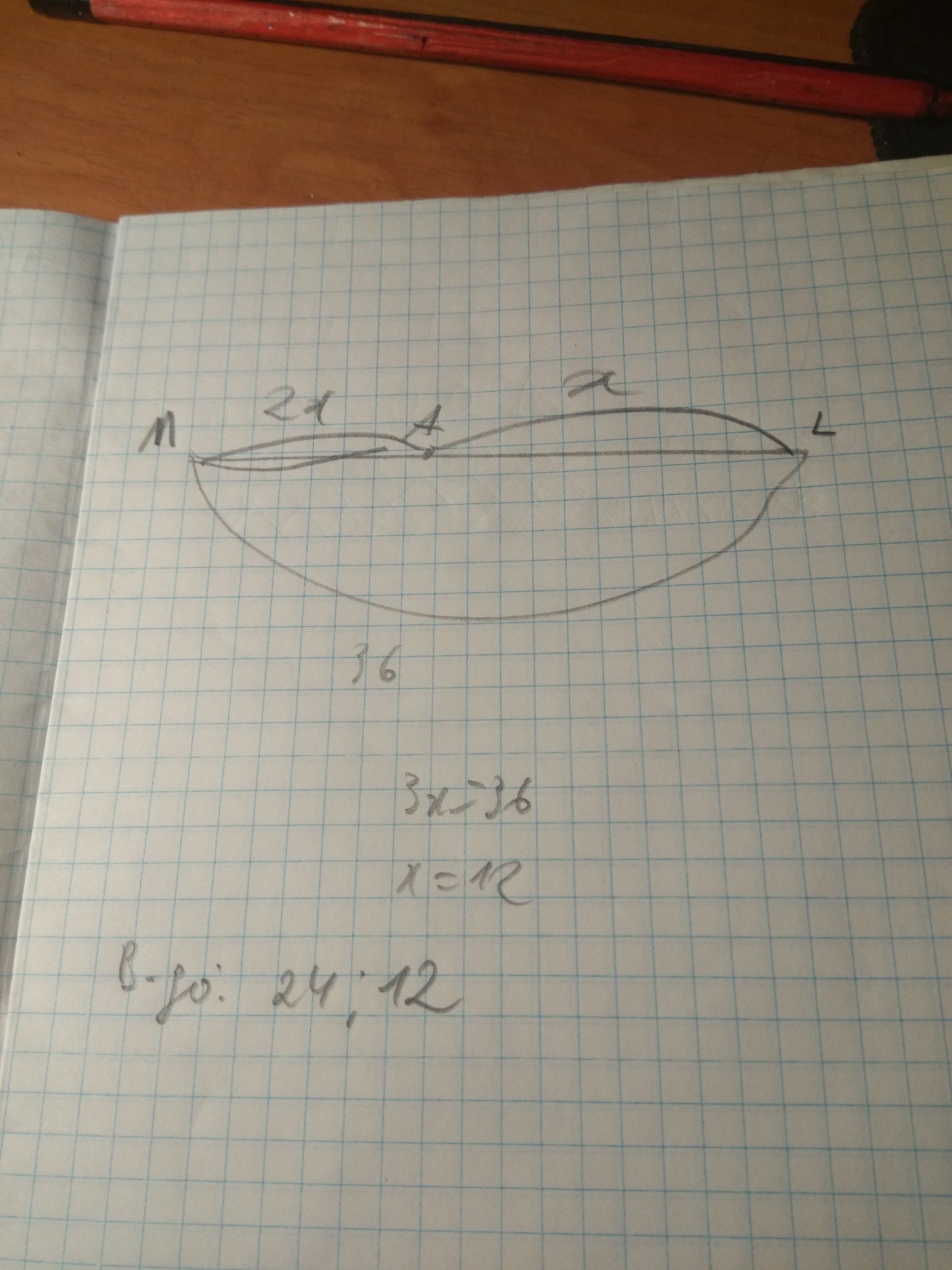 Точка А лежить на відрізку МЛ зовдовжки 36 см.Знайдіть довжини відрізків МА і АЛ,якщо відрізок МА у 2 рази довший за відрізок АЛ