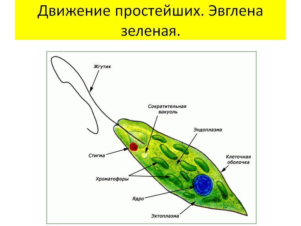 Эвглена зеленая типичный представитель растительных жгутиконосцев. Тело-клетка имеет вытянутую форму (смотри рисунок). Цитоплазма имеет два слоя – эктоплазму и эндоплазму. На переднем конце располагается глотка, один жгутик, светочувствительный глазок – стигма, благодаря которому она различает свет и тень, и сократительная вакуоль. В цитоплазме располагается порядка 20 хроматофоров. При хорошем освещении эвглена фотосинтезирует за счет наличия хроматофоров. Стигма дает возможность проявления положительного фототаксиса (движения в сторону света). При плохом освещении питается осмотически.