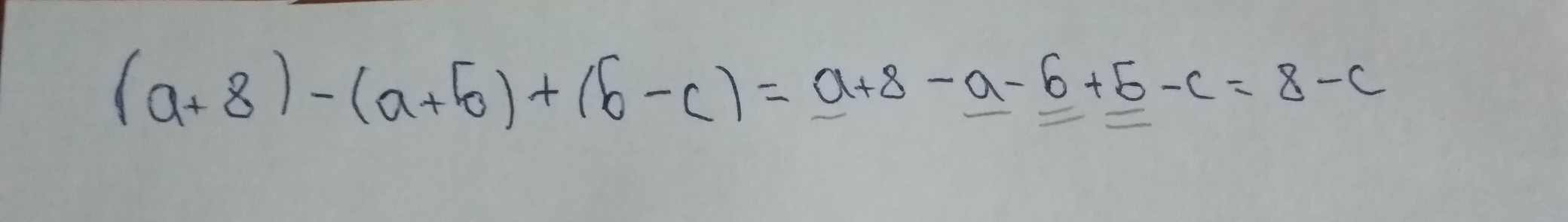 Пошаговое объяснение:(а+8)-(а+б)+(б-с)= а+8-а-б+б-с=8-с