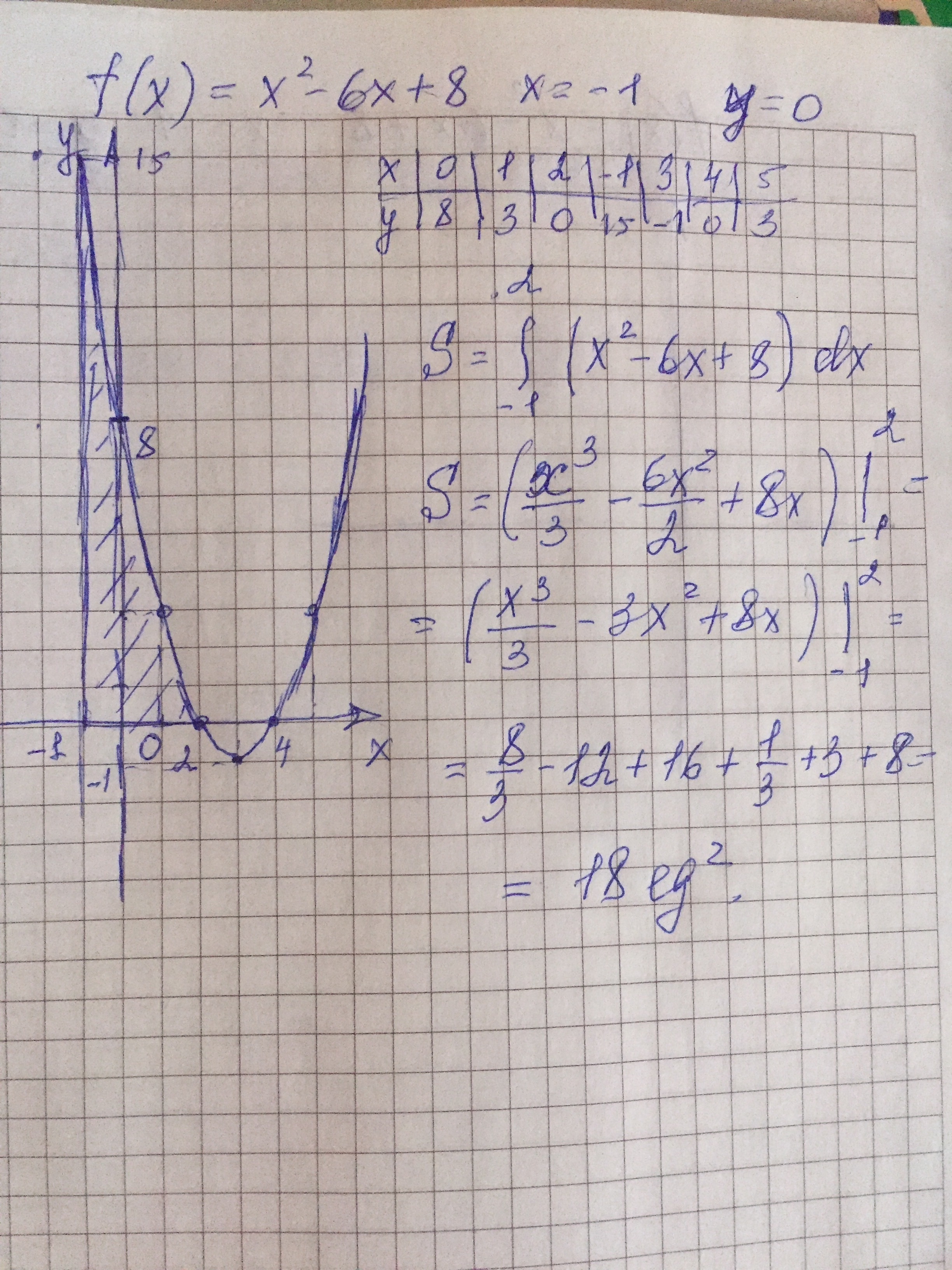 Найдите площадь фигуры,ограниченной графиком функции f(x)= x2- 6x + 8 ,прямыми x=-1 и осью абсцисс