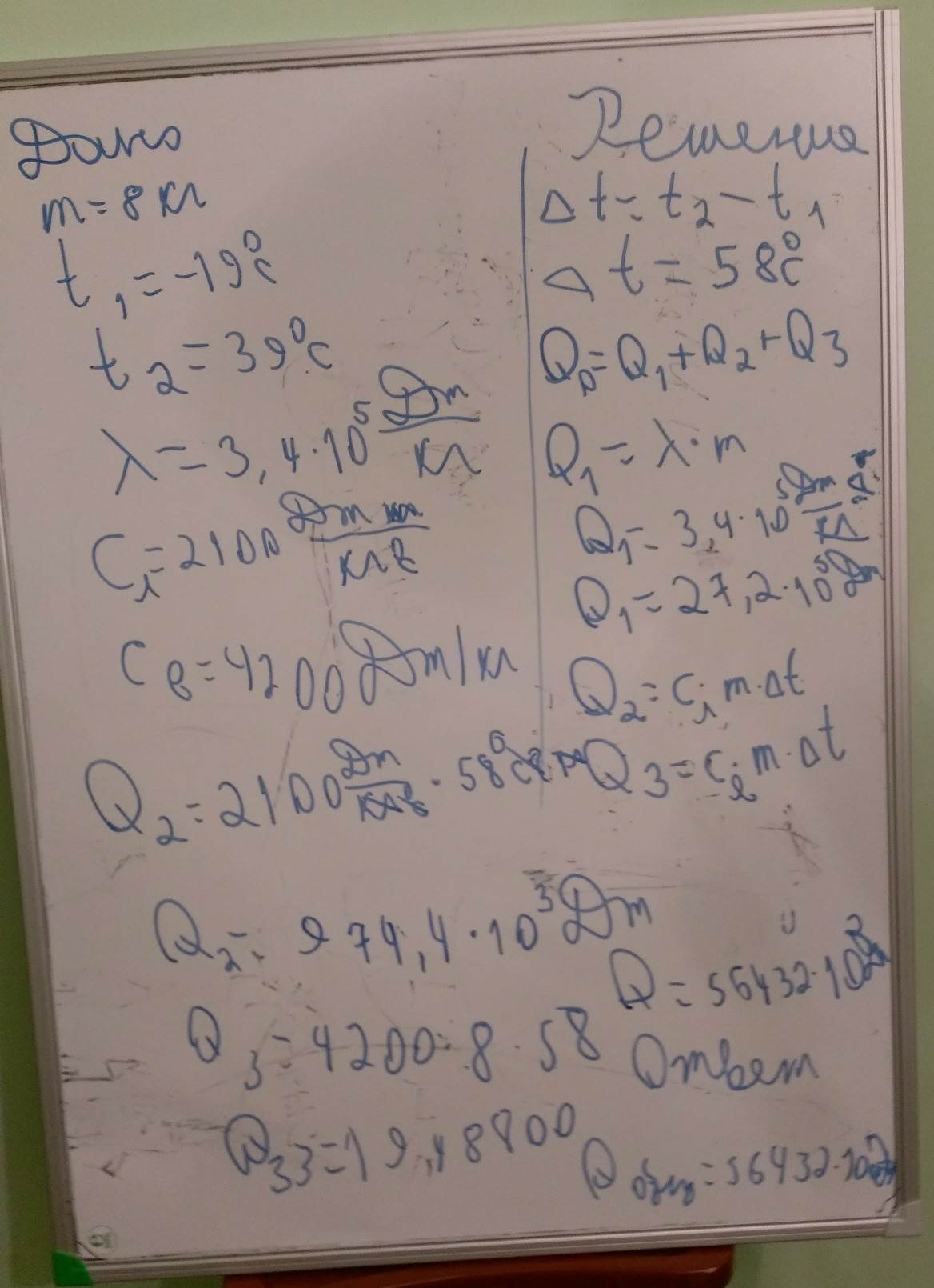 Температура плавления льда 0 °С, удельная теплота плавления льда 3,4⋅10( десять в пятой ) Джкг, удельная теплоёмкость льда 2100Джкг⋅°С, удельная теплоёмкость воды 4200Джкг⋅°С.