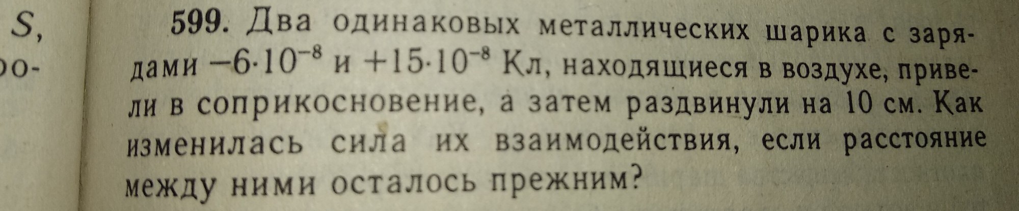 ! Помогите пожалуйста! Два одинаковых металлических шарика с зарядами -6*10^-8 и +15*100^-8 Кл, находящиеся в воздухе, привели в соприкосновения, а затем раздвинули на 10 см. Как изменилась сила их взаимодействия, если расстояние между ними осталось прежним