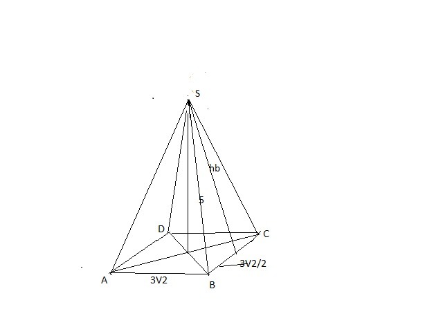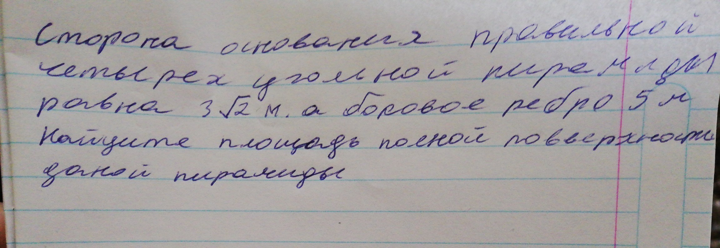 сторона основания правильной четырёх угольной пирамиды равна 3 и 2 в корне м а боковое ребро 5м найдите площадь полной поверхности данной пирамиды
