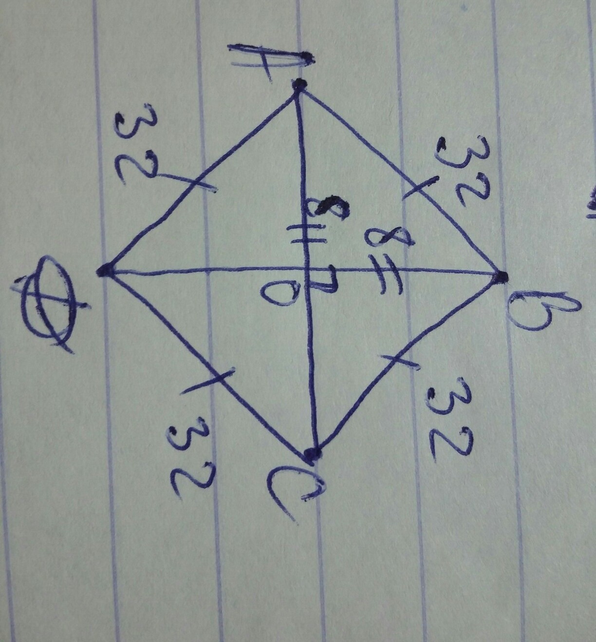 расстояние от точки пересечения диагоналей ромба до одной из его сторон равно 8,а одна из диагоналей ромба равна 32.Найдите угол между большей диагональю и стороной ромба.Ответ дайте в градусах