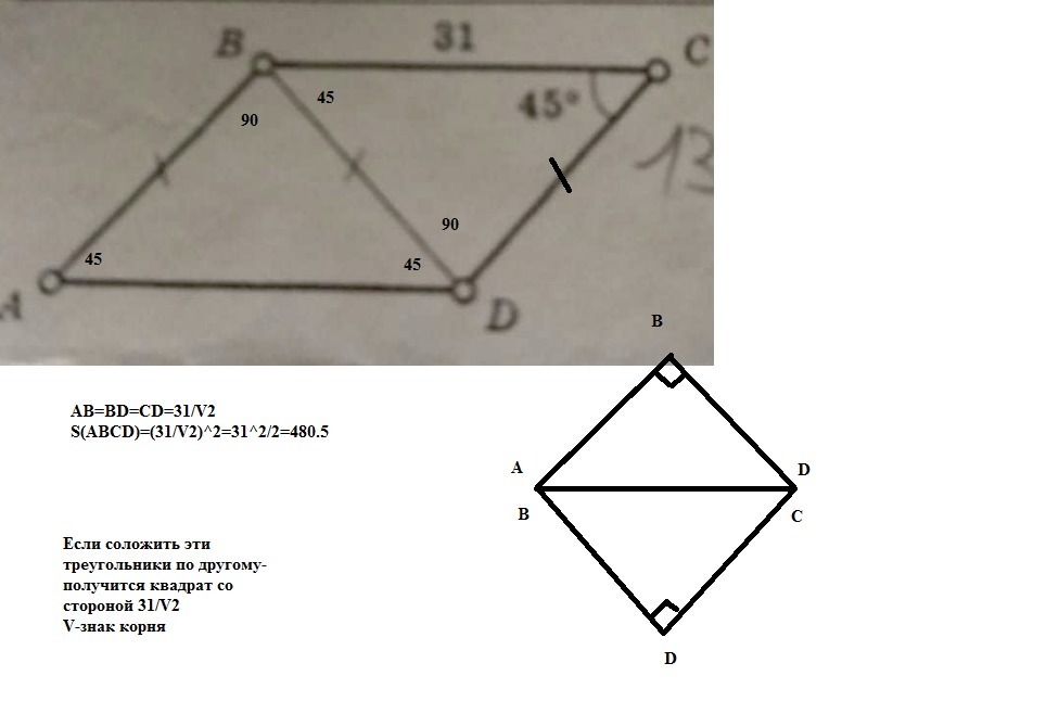 Sпараллелограмма = 31² / 2 = 961 / 2 = 480.5