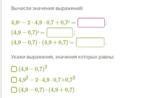 1); 2) = 4,9 * 4,9 - 2 * 4,9 * 0,7 + 0,7 * 0,7