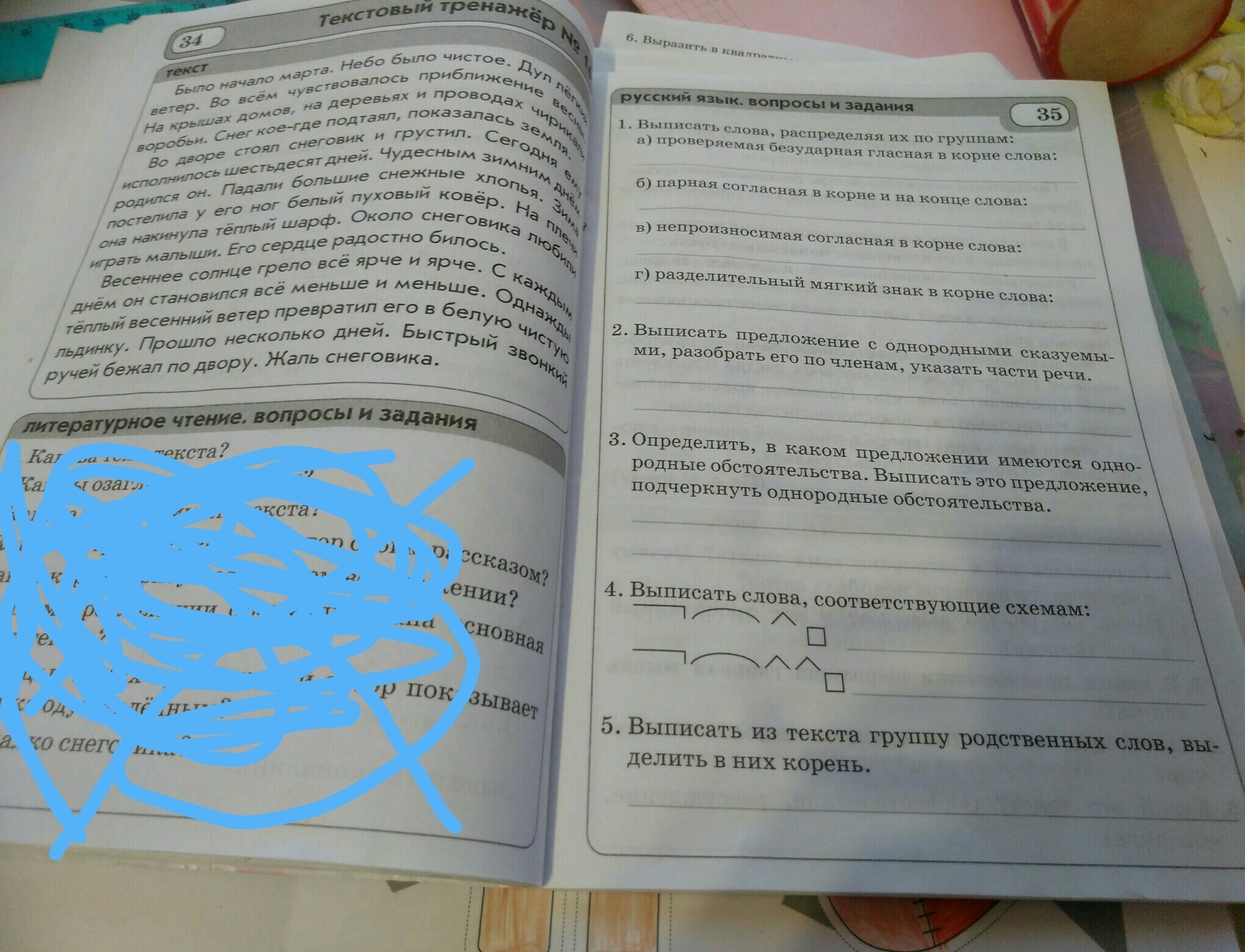 1. а) приближение (близко), весны (вёсны), домов (дом), на деревьях (дерево), воробьи (воробушек), показалась (кажется), земля (земли), во дворе (двор), стоял (стойко), снеговик (снег), грустил (грусть), родился (род), большие (больше), зима (зимний), постелила (стелется), ковер (коврик), играть (игры), бежал (бег)