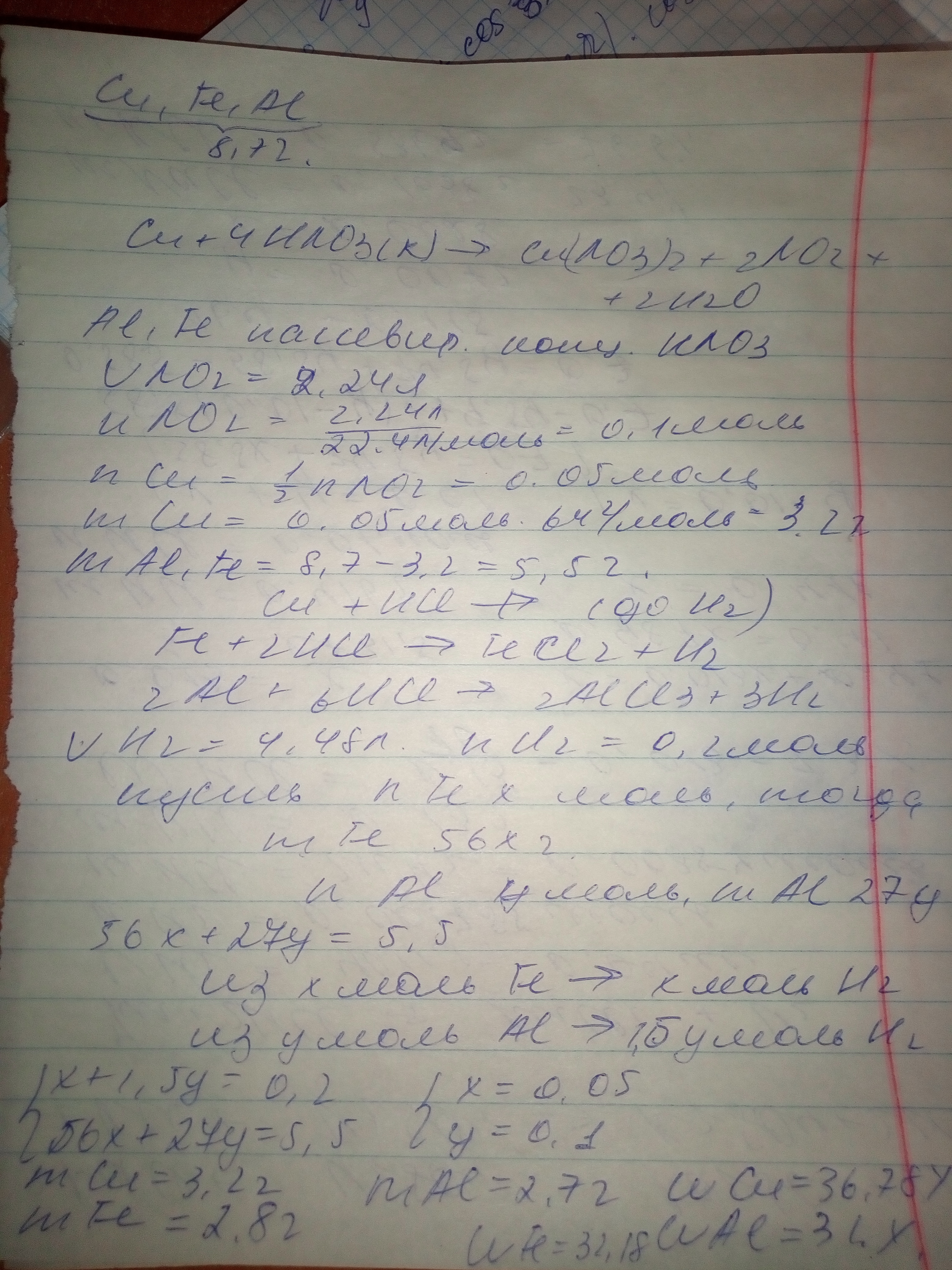 При обработке 8,7 г смеси меди, железа и алюминия избытком раствора соляной кислоты выделилось 4,48 л газа (н.у.), а при действии на такое же количество смеси концентрированной азотной кислоты выделилось 2,24 л газа (н.у.). Определить массовые доли металлов в исходной смеси.