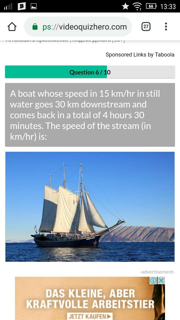 Лодка, скорость которой 15 км/ч в стоячей воде, проходит 30 км вниз по течению и возвращается всего за 4 часа 30 минут. Скорость течения (в км/час) составляет: 5 км/ч