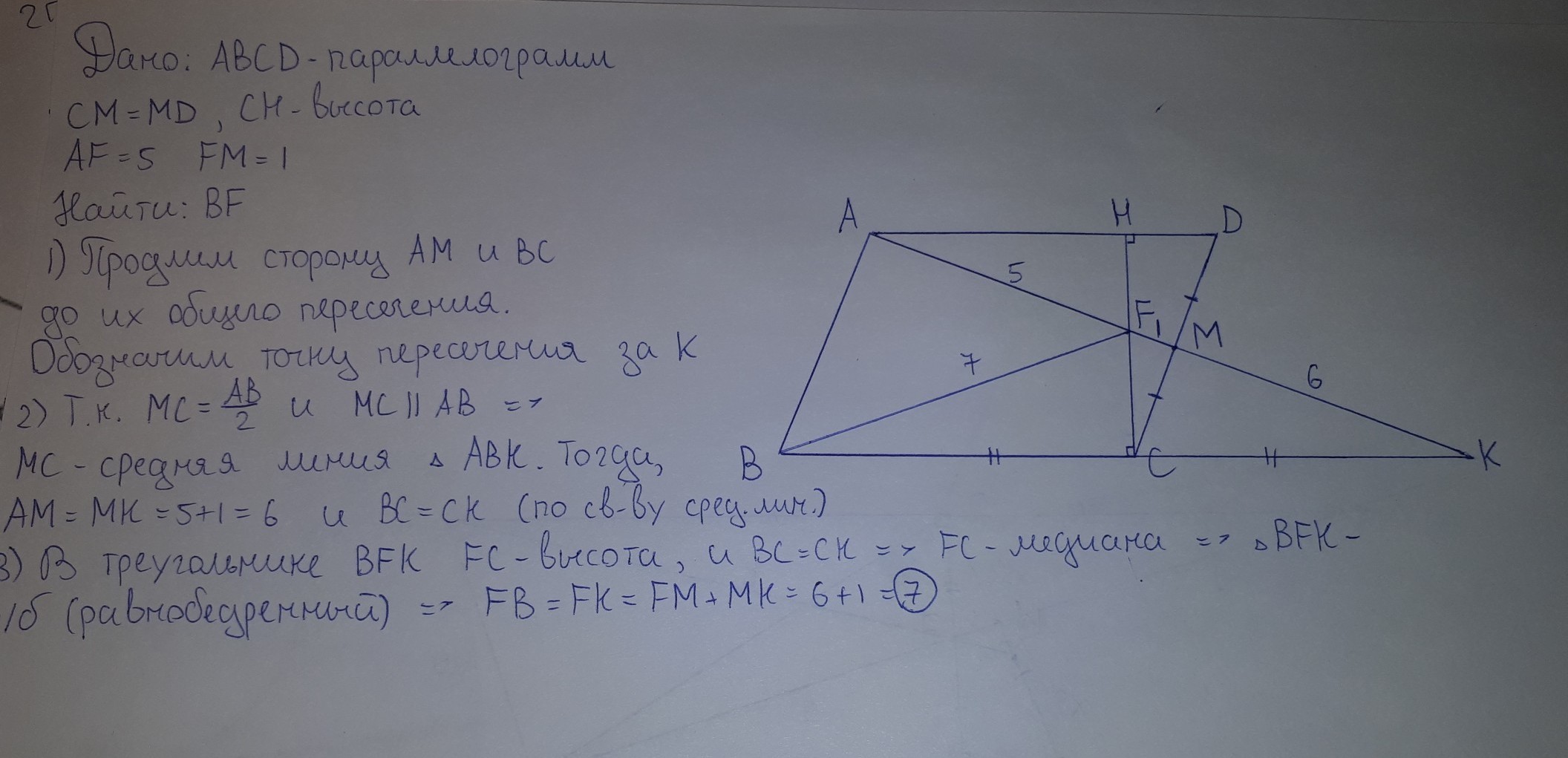 Вершину тупого угла A параллелограмма ABCD соединили с точкой M — серединой его стороны CD . Высота CH параллелограмма, опущенная на сторону AD , пересекает отрезок AM в точке F . Найдите BF , если AF=5 и FM=1