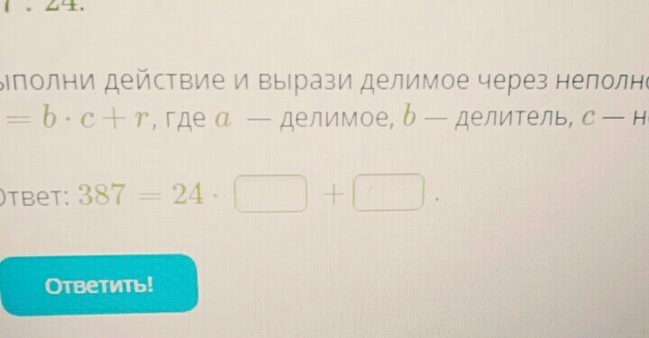 Выполни действие и вырази делимое через неполное частное, делитель и остаток в виде равенства а-б•с+р, где а-делимое, б-делитель, с-неполное частное, р-остаток
