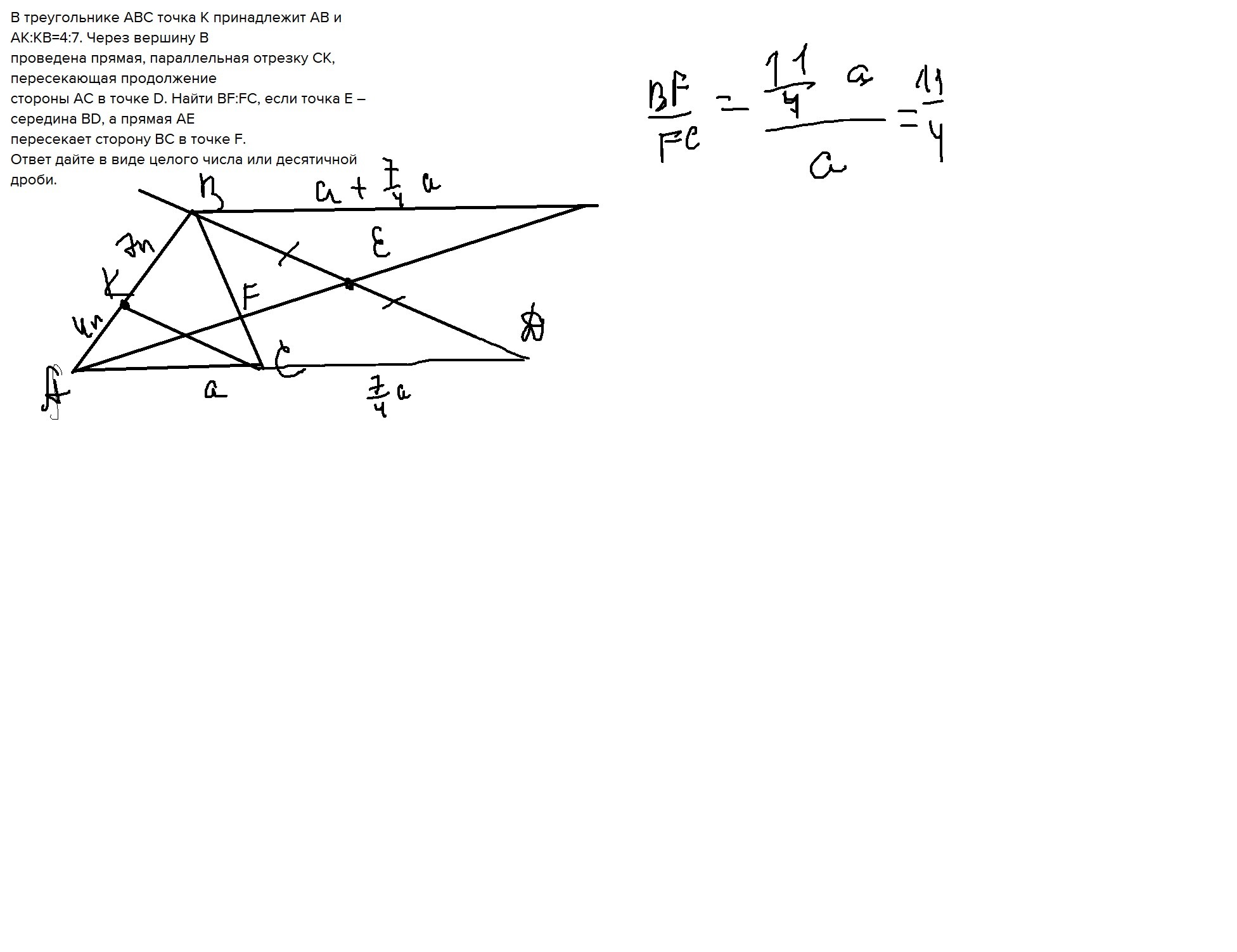 В треугольнике АВС точка К принадлежит АВ и АК:КВ=4:7. Через вершину В