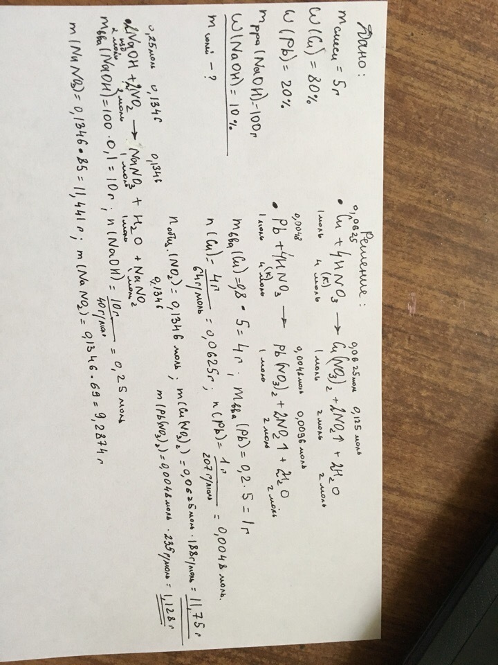 Кусочек бронзы массой 5 г, содержащей 80% меди и 20% свинца растворили в избытке концентрированной азотной кислоты. Выделившийся газ полностью прореагировал со 100 г 10% раствора гидрооксида натрия. Суммарная масса образовавшихся в растворе солей составила?