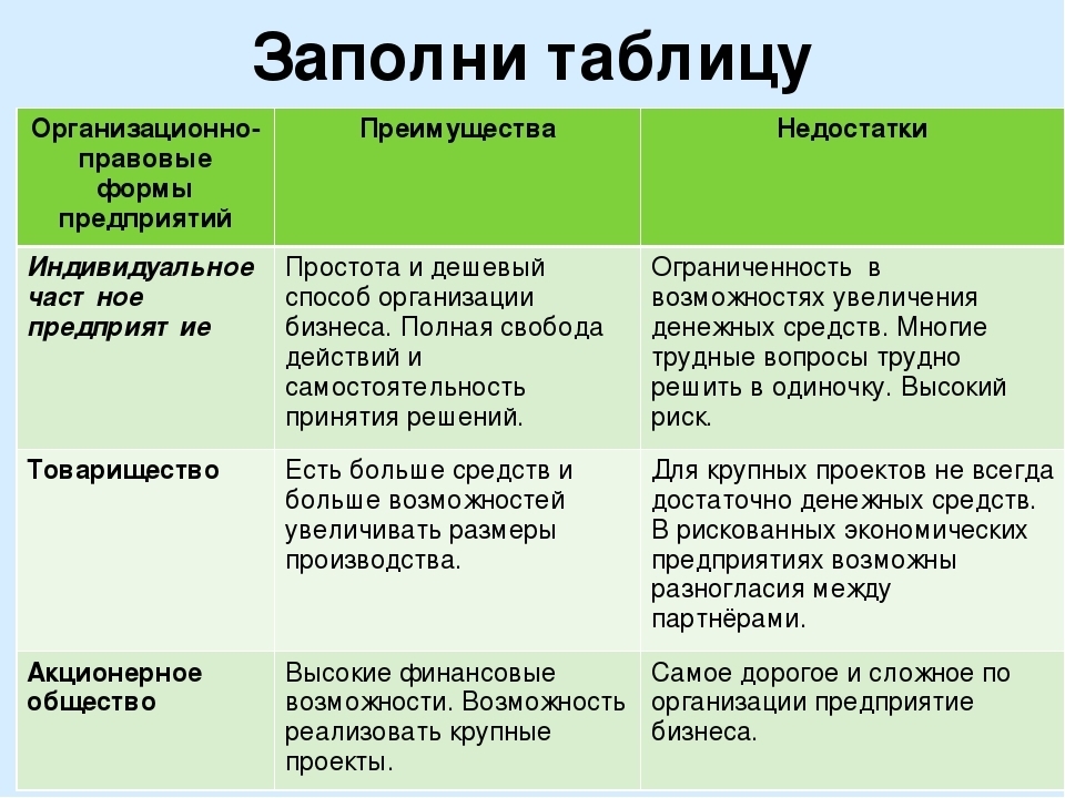 Выберите три типа (формы) коммерческих организаций и напишите по паре "преимущество-недостаток" к каждому типу. Например: