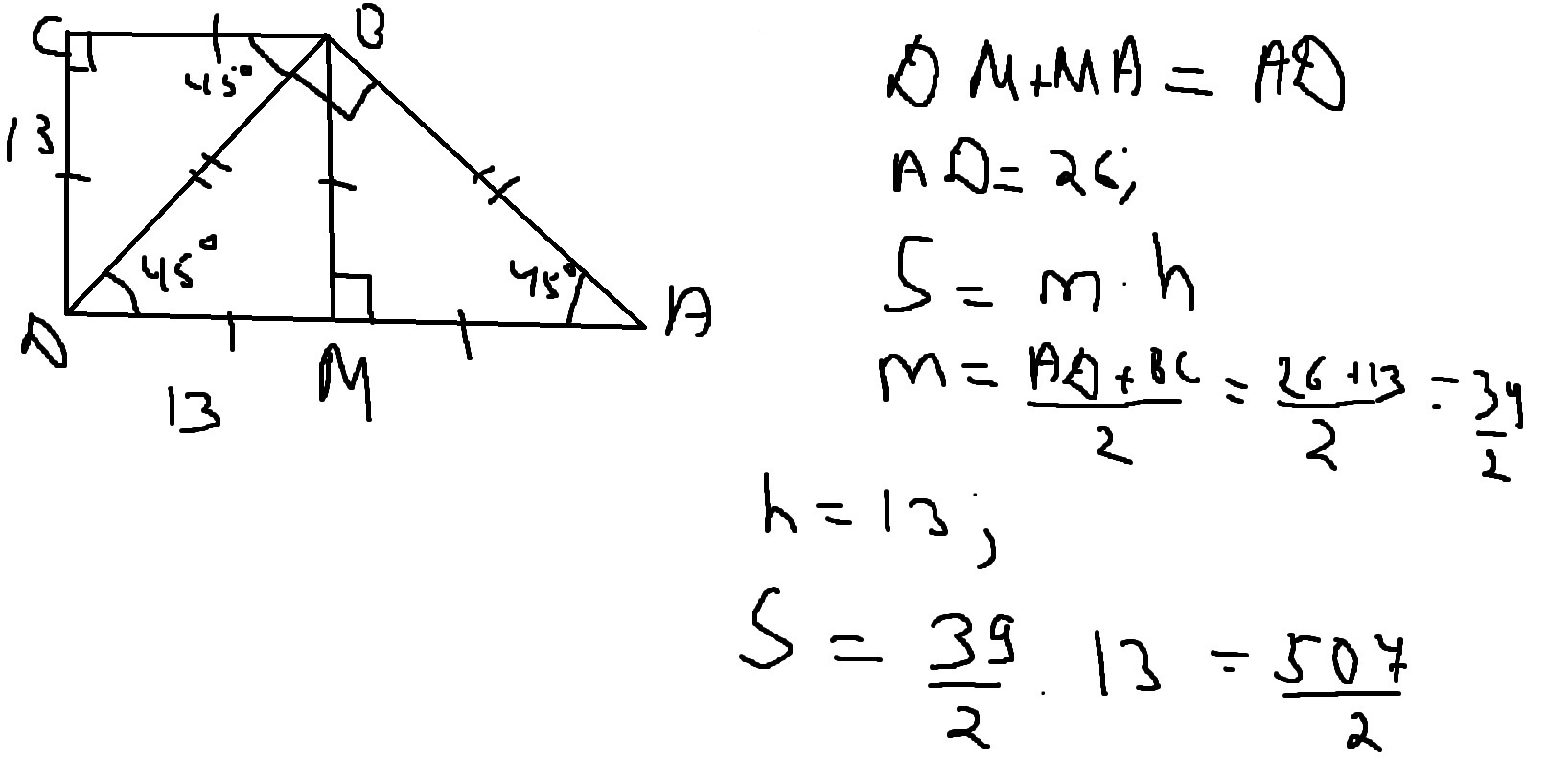 AD = DM+AM; AD = 26; S = m*h, где m - средняя линия, m = (AD+BC)/2 = 26+13/2 = 39/2, s = 39/2 * 13 = 507/2