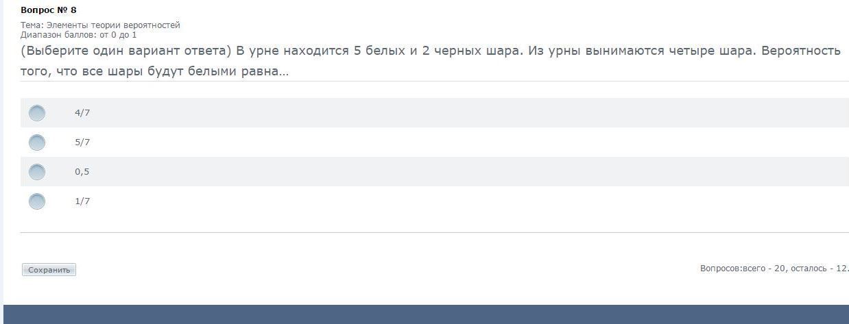 В 4-й раз 2/4, итого 5/7*4/6*3/5*2/4=1/7