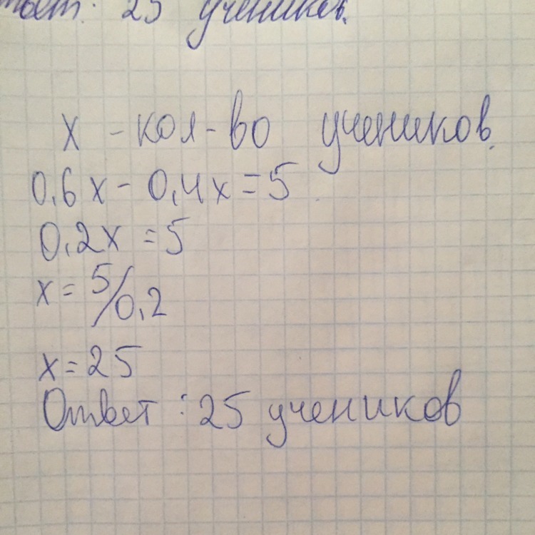 60 - 40 = 20% на столько % мальчиков больше чем девочек, в числовом количестве из задачи нам известно, что это 5