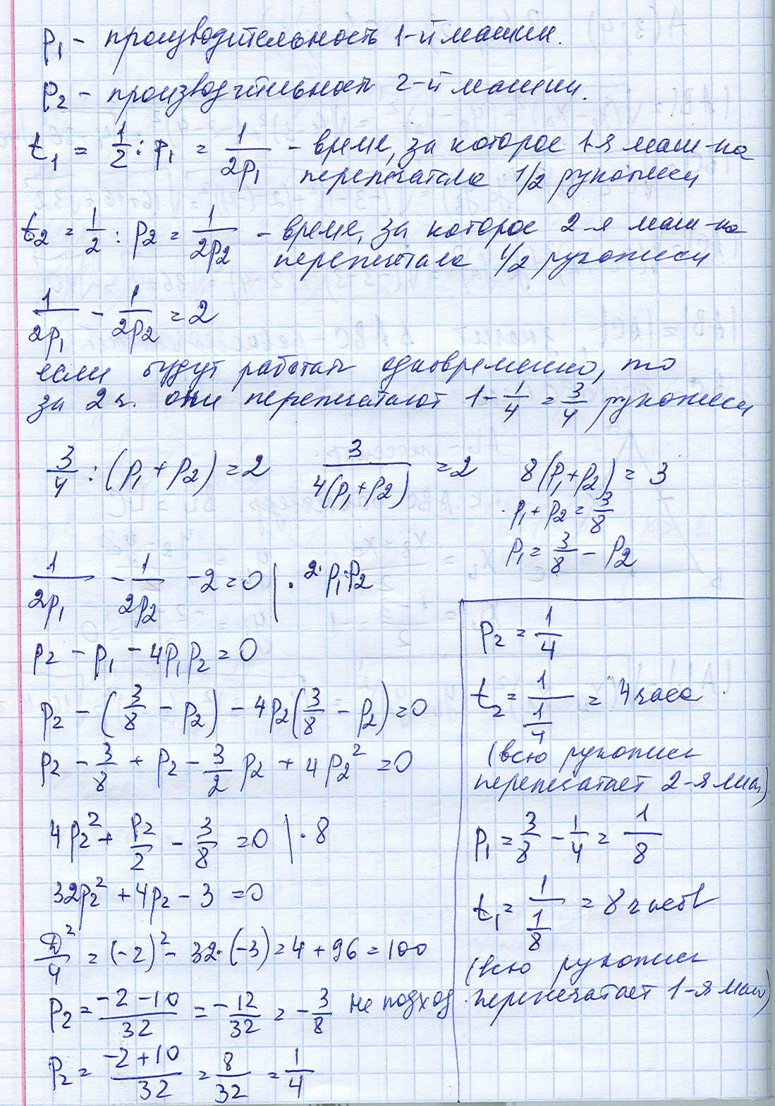 3х²-10х+8=0. х=4 или х= 1 1/3- это не подходит к задаче, т.к х-2 будет отрицательным. Первая машинистка напечатает рукопись за 4*2=8 ч, а вторая - 4*2-4=4 часа.