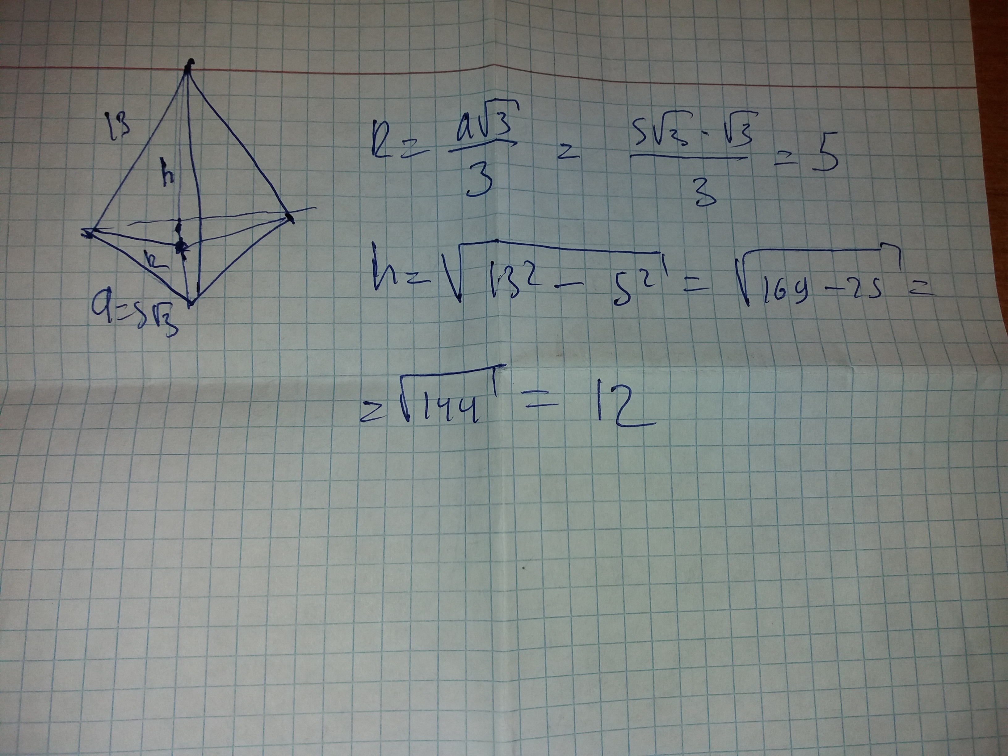 Сторона равностороннего треугольника равна 5√3 см. Точка А равноудалена от каждой вершины треугольника на 13 см. Вычислить длину перпендикуляра опущенного из точки А к плоскости треугольника