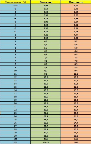 В первом вложении - давление насыщенного водяного пара (мм. рт. ст.) и его плотность (г/м³, или 10⁻³ кг/м³).