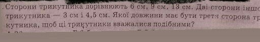 СРОЧНО! сторони трикутника дорівнюють 6 см 9 см 13 см дві сторони іншого трикутника 3 см і 4,5 см. Якої довжини має бути третя сторона трикутника щоб ці трикутники вважалися подібними?