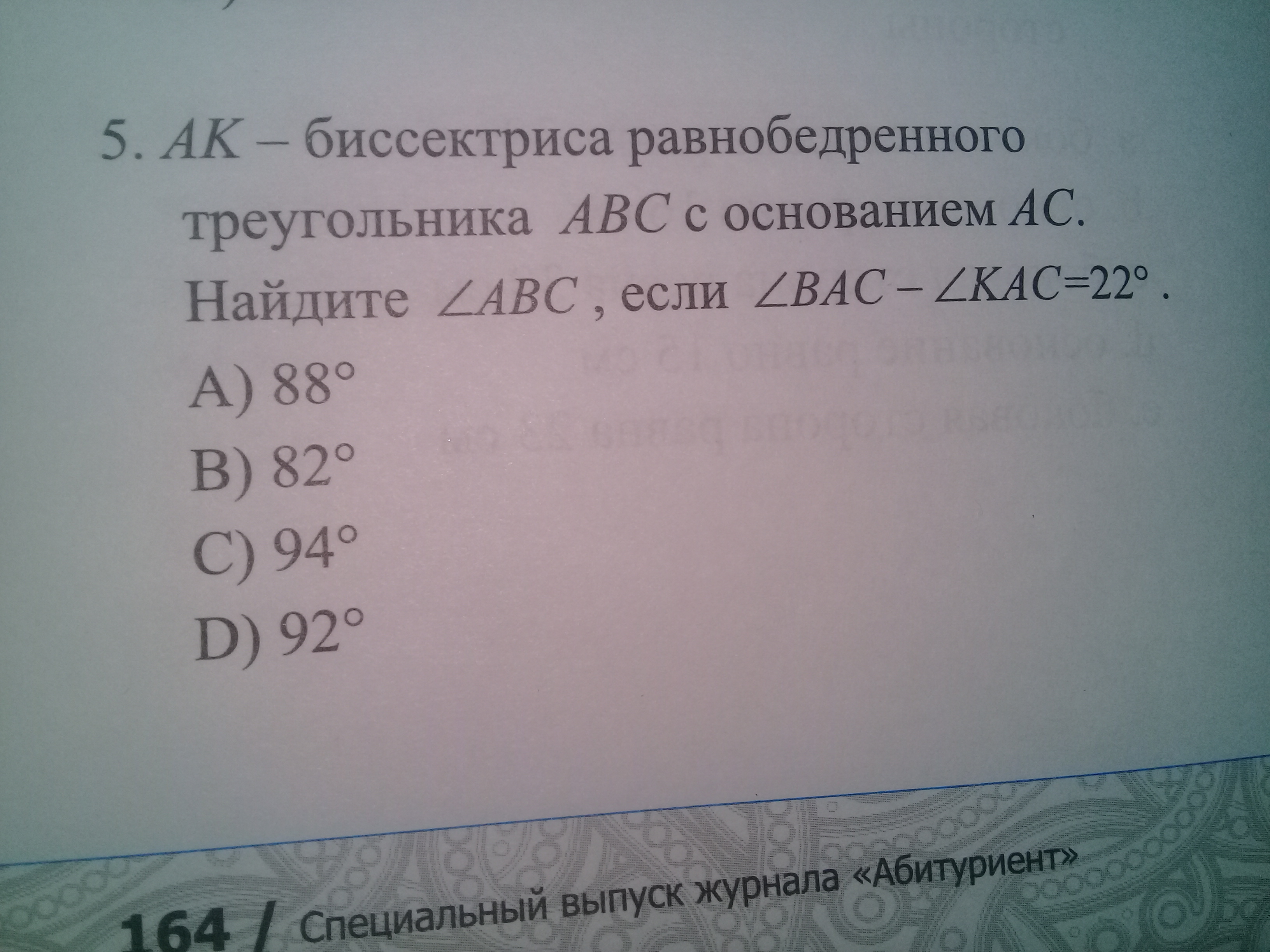 так как АК биссектриса то ∠ВАС-∠КАС =22° это и есть угол ВАК 22*2=44°=∠ВАС у равнобедренного треуг углы при основании равны тогда и ∠ВАС=∠ВСА=44° Сумма углов треугольника =180° ∠АВС=180-44*2=180-88= 92°