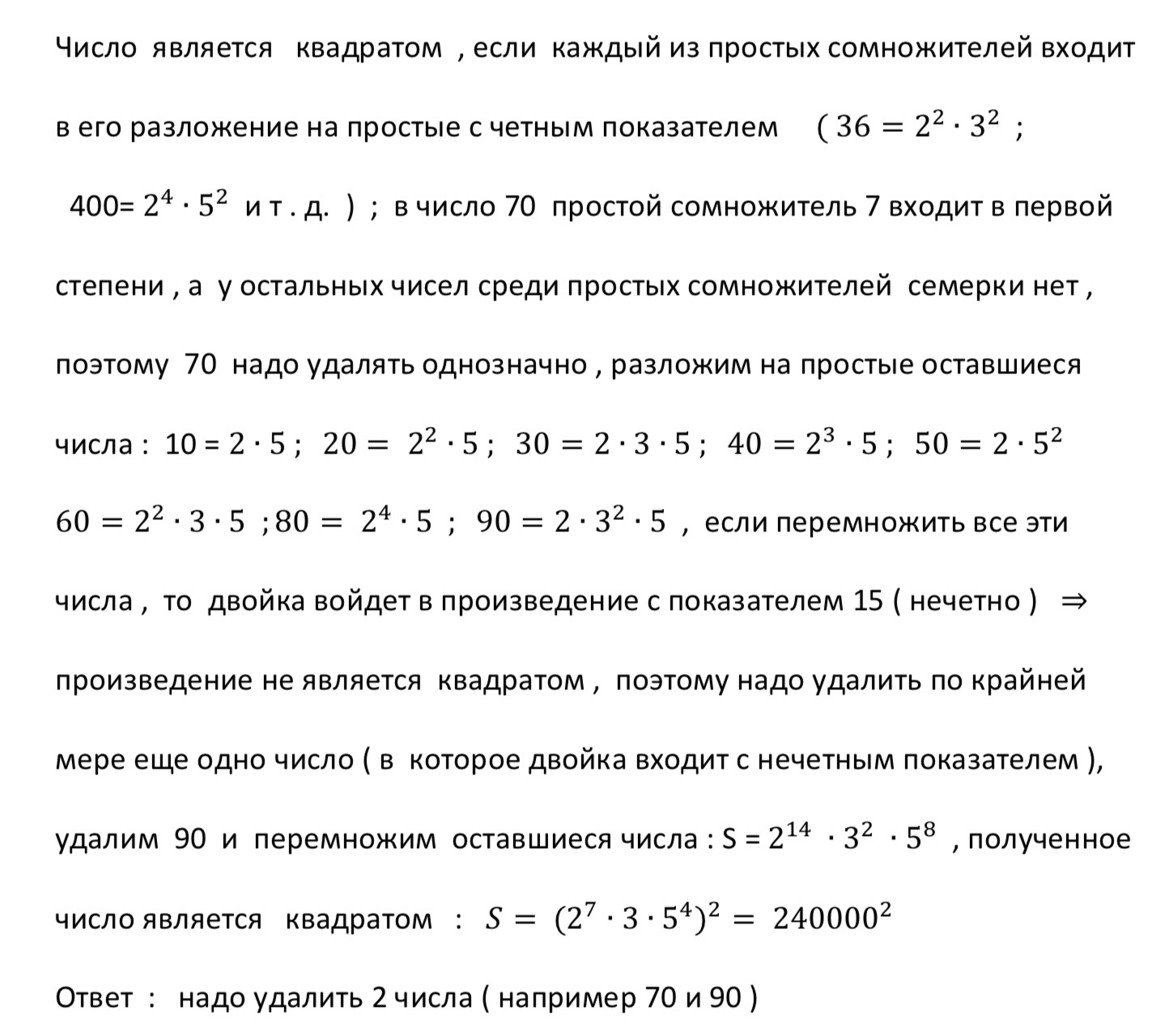 Какое наименьшее количество чисел нужно удалить из набора 10, 20, 30, 40, 50, 60, 70, 80, 90, чтобы произведение оставшихся было точным квадратом?