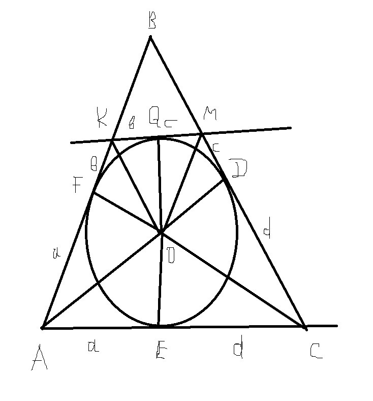 В треугольник АВС вписана окружность, и к ней проведена касательная, пересекающая сторону АВ в точке К, а сторону ВС в точке М. Известно, что АК = 3, КМ = 2, МС = 4. Найдите периметр четырехугольника АКМС.