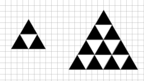Ване подарили шоколадку в форме равностороннего треугольника. Шоколадка была сделана так, что черные и белые дольки в ней чередовались как на шахматной доске (уголки – черные дольки). Ване стало интересно, а насколько больше было бы черных долек, чем белых, если бы шоколадка была гигантской и сторона ее была бы равна 2019? На рисунке изображена шоколадка со стороной 3.