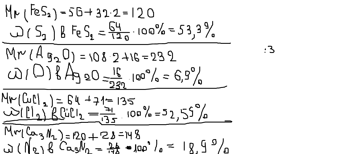 Помагите!!!!!!!Вычеслить массовые доли элементов : FeS2.Ag2O.CuCl2.Ca3N2 )))зарание спасибо ))) только чтоб в ответах получилось в а)46,67%;.53,33%;б)93.10%;6.90%; в)47.41%