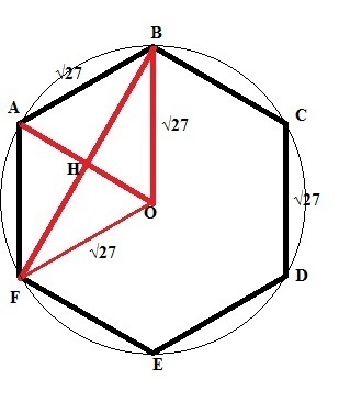 Если без тригонометрии: в правильном шестиугольнике стороны равны, а радиус описанной окружности равен стороне. => АВ=ОА=ОВ=√27.