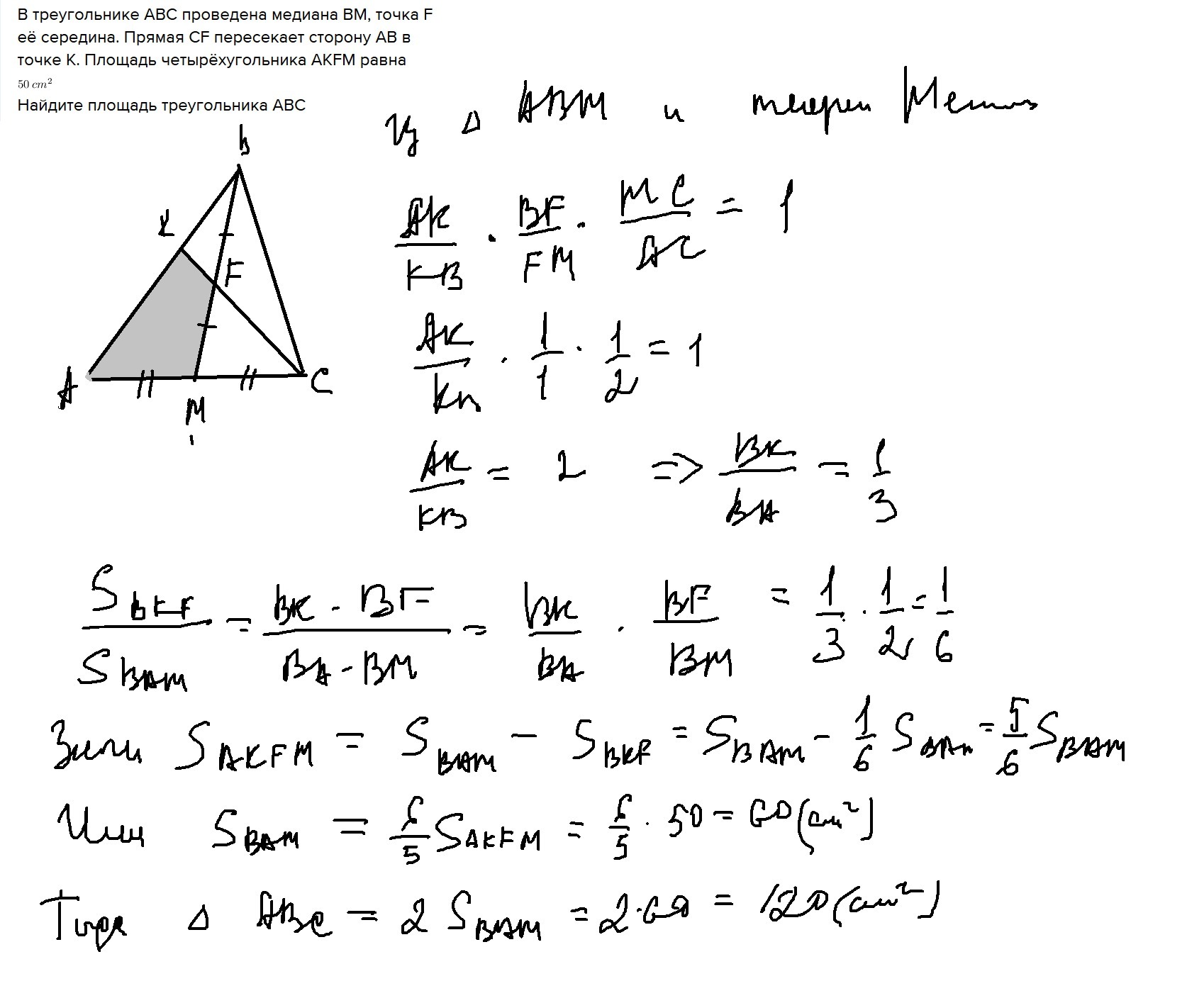 в треугольнике АВС проведена медиана ВМ, точка F её середина. Прямая CF пересекает сторону AB в точке K. Площадь четырёхугольника AKFM равна