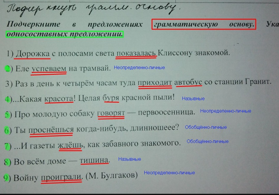 Красным подчеркнуты грамматическая основа, зеленым выделены односоставные предложения, синим указан тип односоставного предложения.