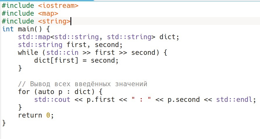 Здравствуйте! 20 баллов. Кто знает С++? Не понимаю, расскажите, пожалуйста, как ввести словарь в С++? Библиотека map. Для меня важно ввод строк в словаре, где одна превращается в first, а другая в second (в пару множества).