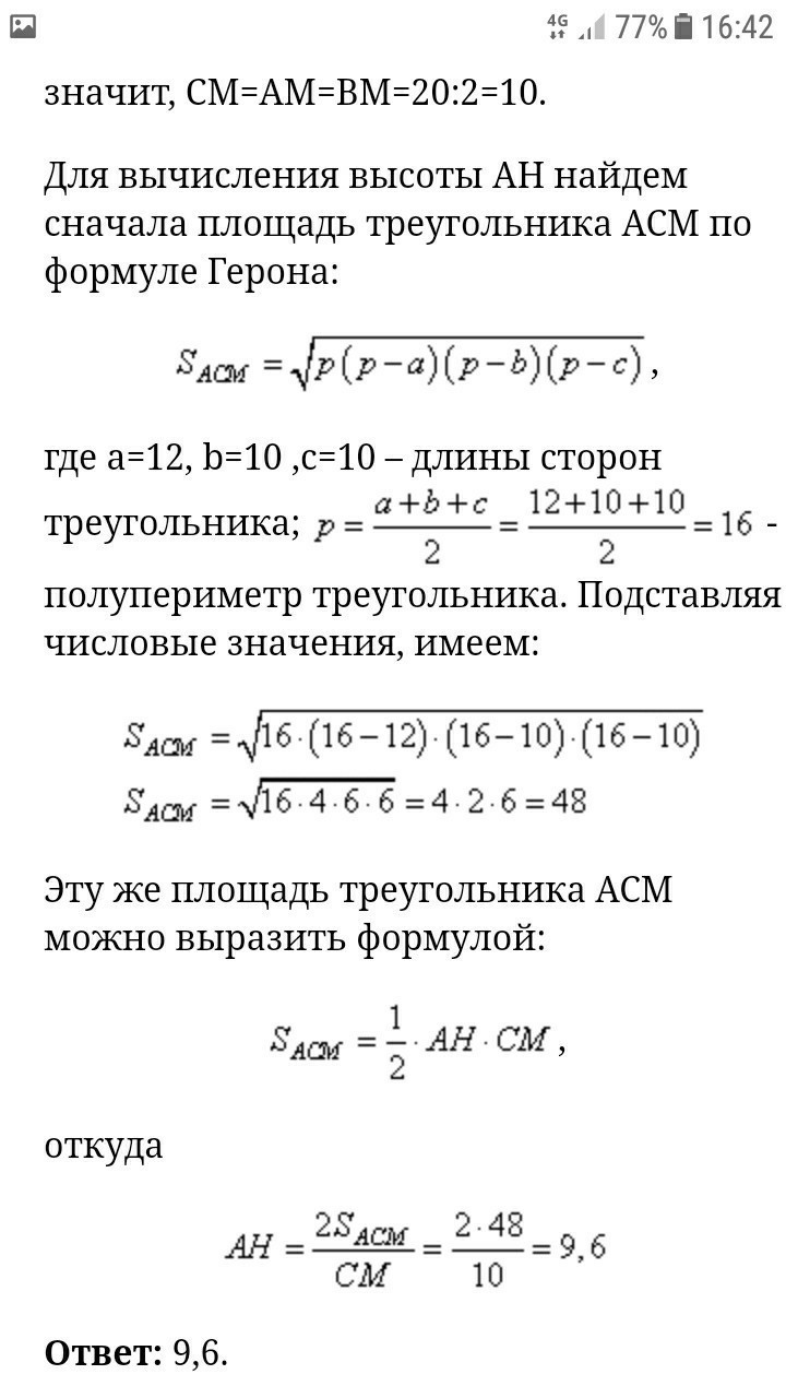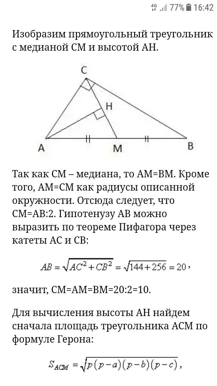 В прямоугольном треугольнике с катетами АС = 12 и ВС = 16 проведена медиана СМ. Найдите высоту АН треугольника АСМ.