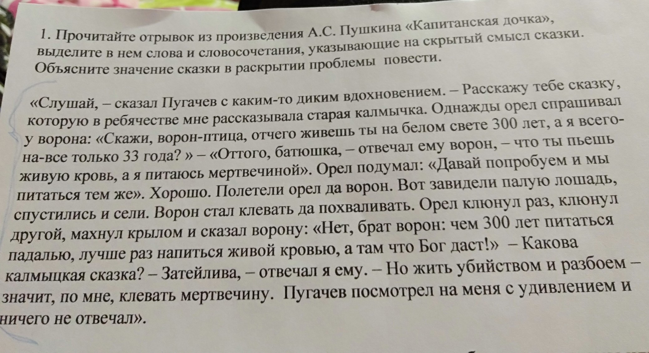 Гринев сравнивается с орлом, благородной птицей, а Пугачев с вороном, который живет только разбоями и убийствами. Сказка указывает на разницу мировоззрения героев и их принципы.