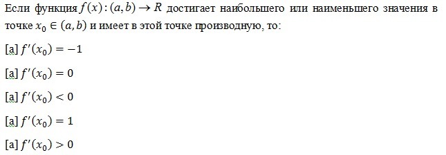 По определению: Если функция f(x) определена и дифференцируема на некотором промежутке (a,b) и во внутренней точке x₀ этого промежутка принимает наибольшее (наименьшее) значение, то необходимо, чтобы f'(x) = 0