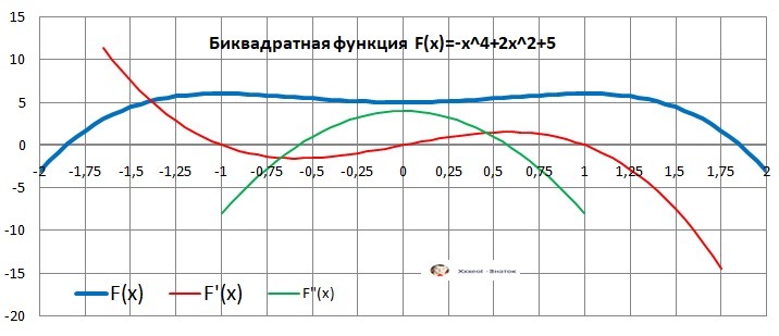 Для большего понимания на рисунке в приложении график и её производных биквадратной функции.