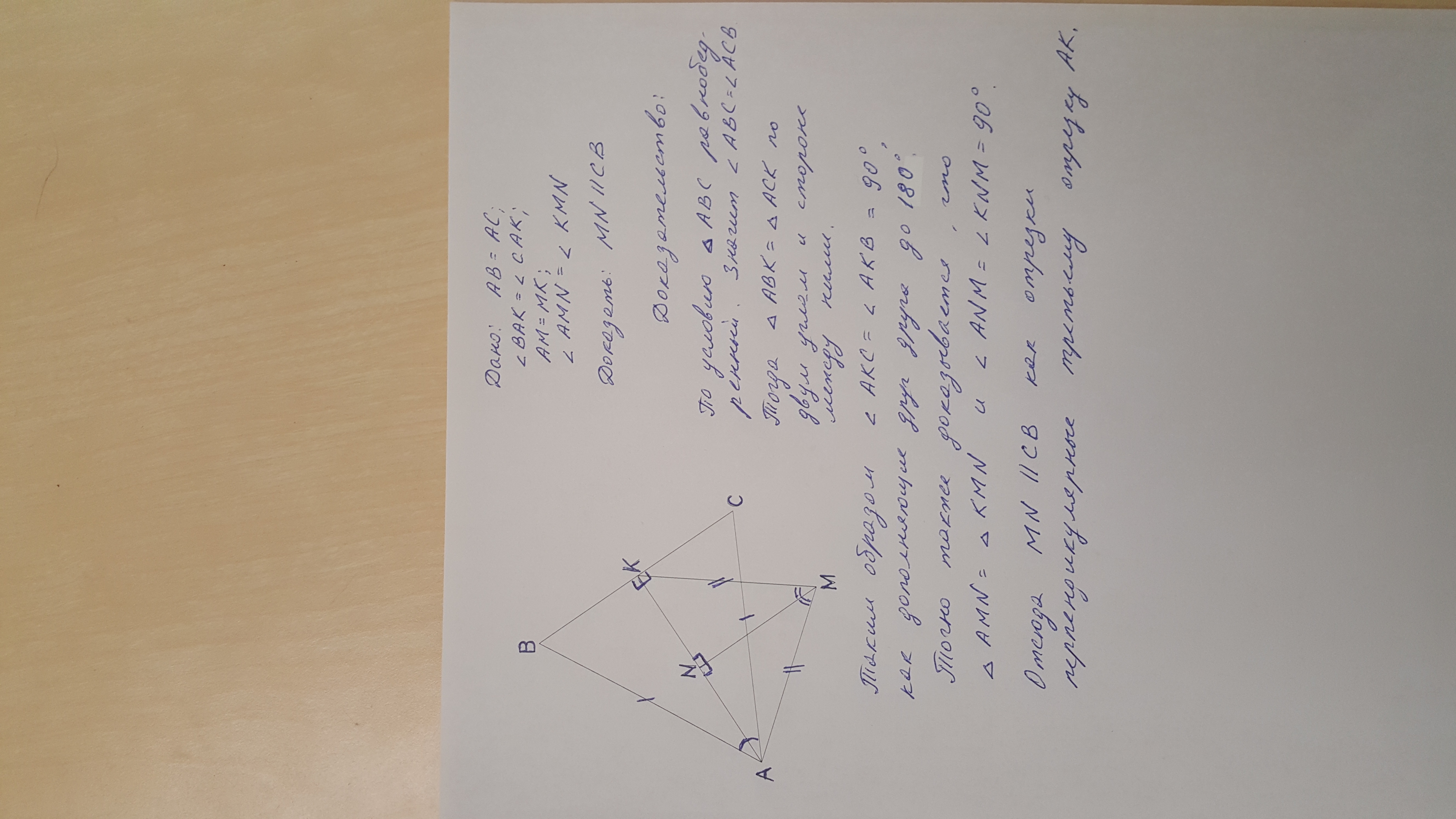 AM=MK; ⇒ΔABC-равноб., ⇒MN-биссектриса, высота; ∠MNA=90°