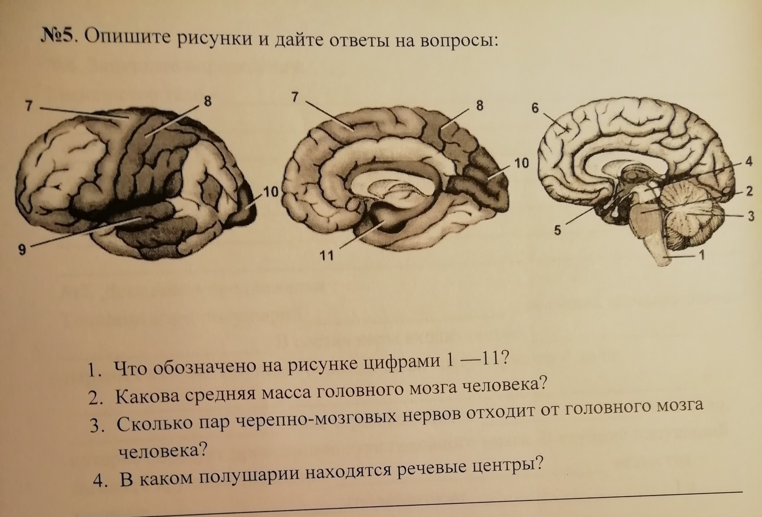 1 продолговатый мозг.3 можечек 2. мост 4. ножки среднего мозга. 5 зрительные бугры 6 лобная доля 7 область тактильной чувствительности 8 теменная доля 9 затылочная доля 10 область зрительного восприятия 11 третий желудочек