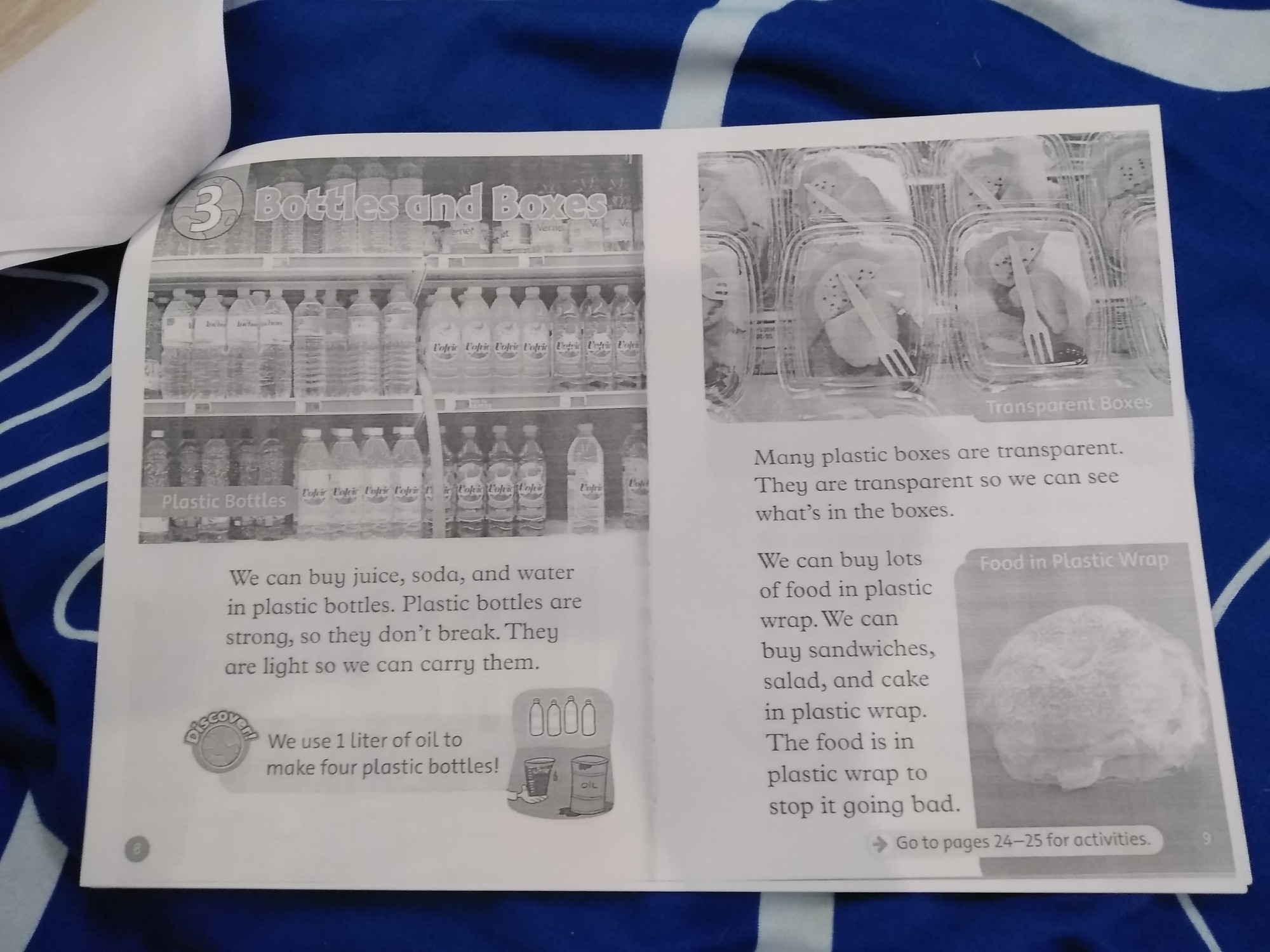 мы можем купить сок,соду и воду в пластиковых бутылках.Пластиковые бутылки надёжные ,они не ломаются.Они лёгкие ,поэтому мы можем носить их.Мы можем использовать литр масла ,чтобы сделать пластиковые бутылки!Множество пластиковых коробок прозрачныe.Они прозрачные,поэтому мы можем видеть,что в них.Мы можем купить много еды в пластиковой упаковке .Можем купить сэндвичи,салаты и пирожные в пластиковой упаковке.Пластиковая упаковка предотвращает порчу еды.