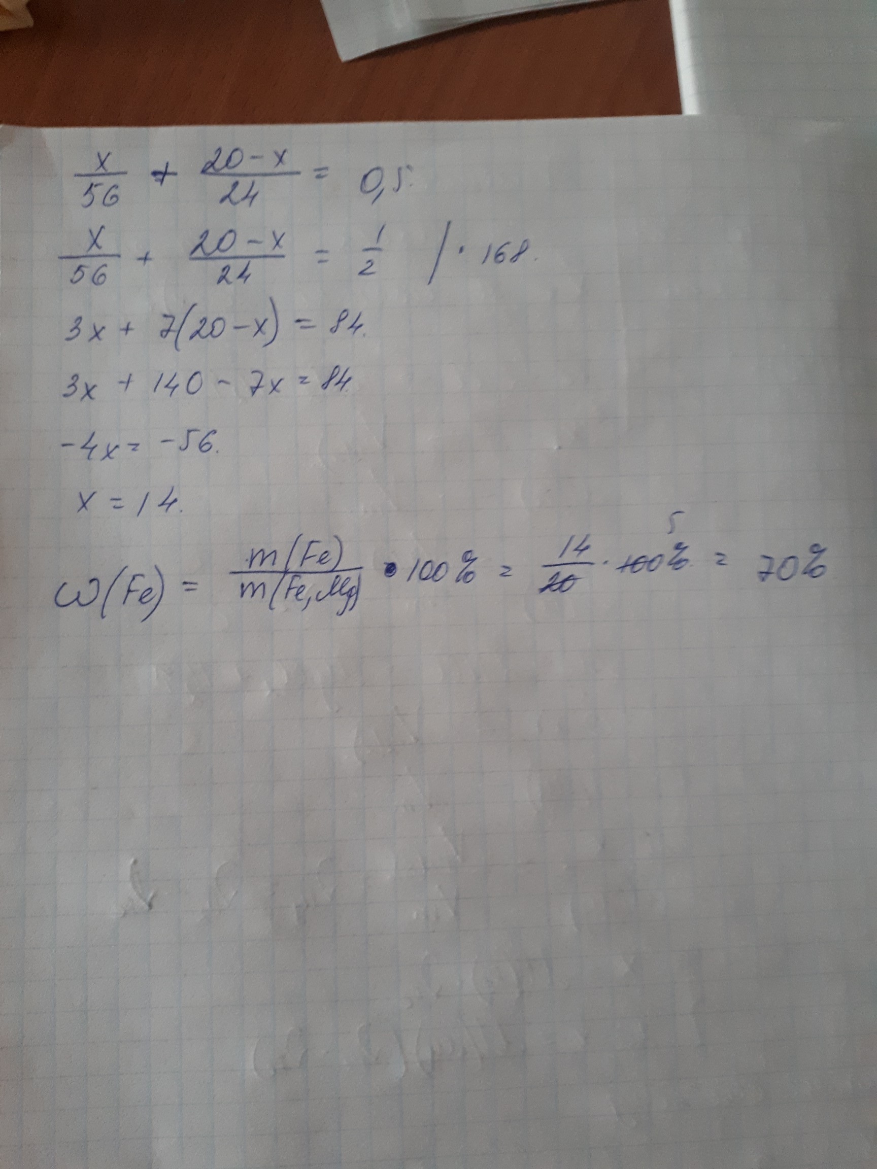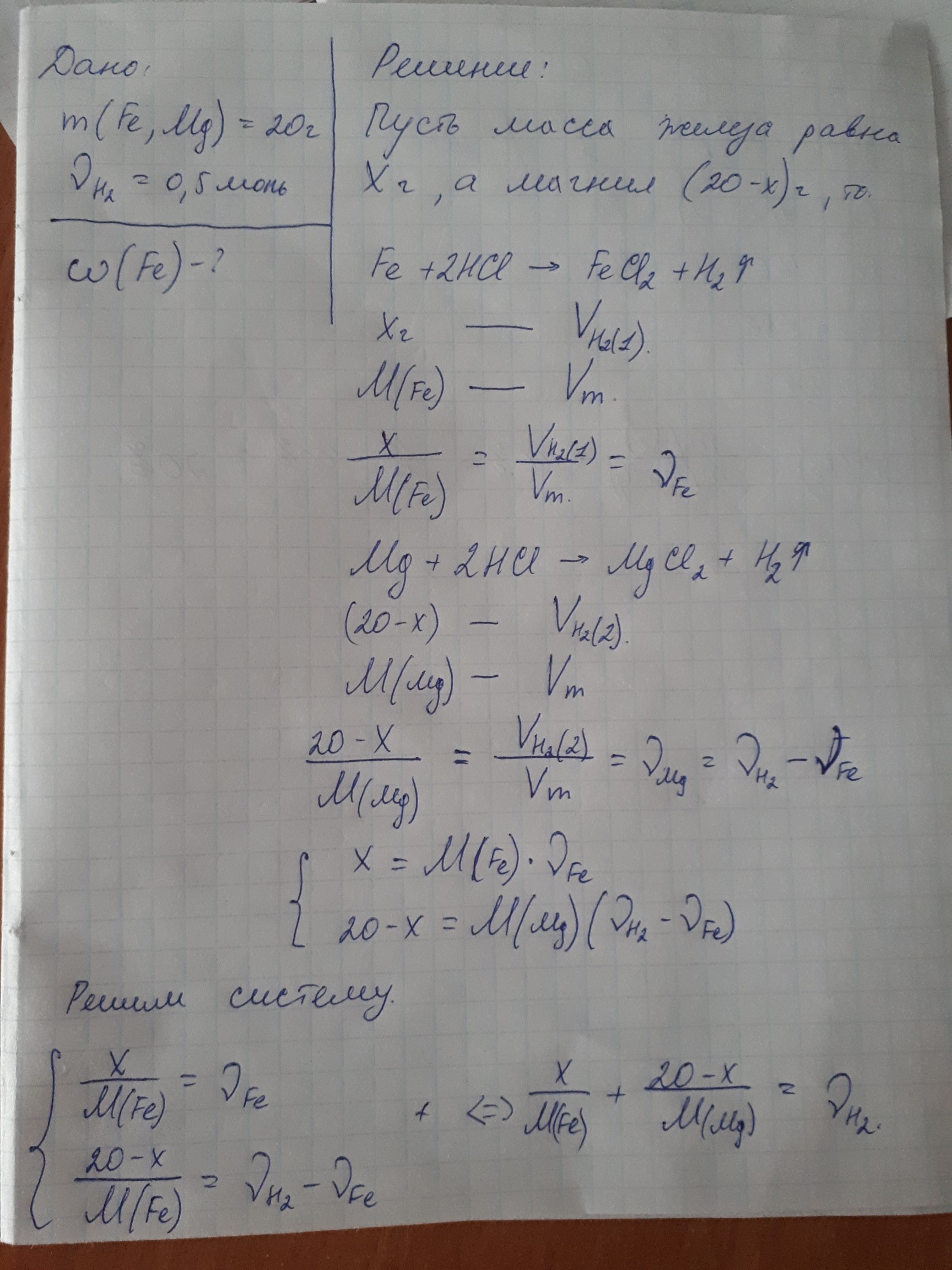 в смеси массой 20 г, состоящий из порошков магния и железа, добавили хлорную кислоту, взятую в избытке. вследствие этого выделился водород количество и веществ 0,5 моль.
