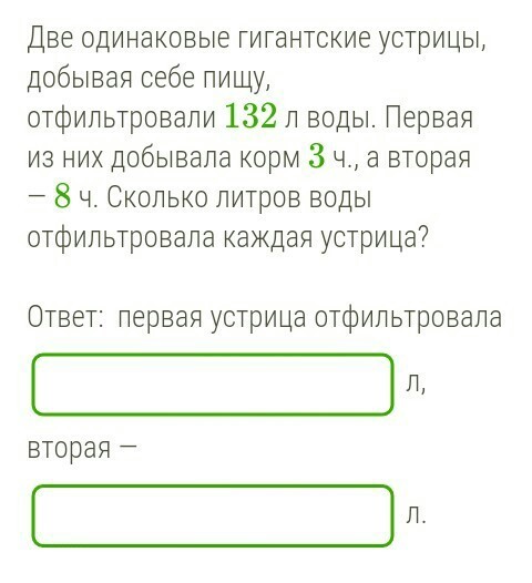 3+8=11(ч)-всего питались обе устрицы. 132:11=12(л)-отфильтровывала каждая устрица в час