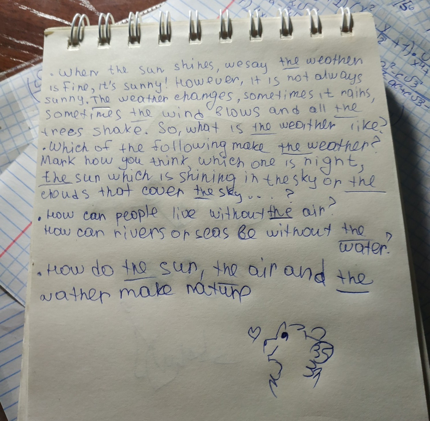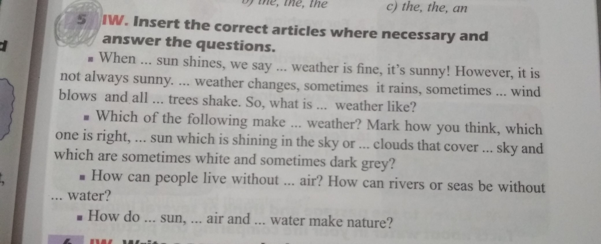 везде the, т.к. артикль The ставится у множественного числа или чего-то конкретного. например в этом тексте погода, небо, солнце - единственные в мире. им нельзя ставить артикль a, т.к. а обозначает неопределенность предмета (какой-то). Артикль а ставится ТОЛЬКО у единственного числа.