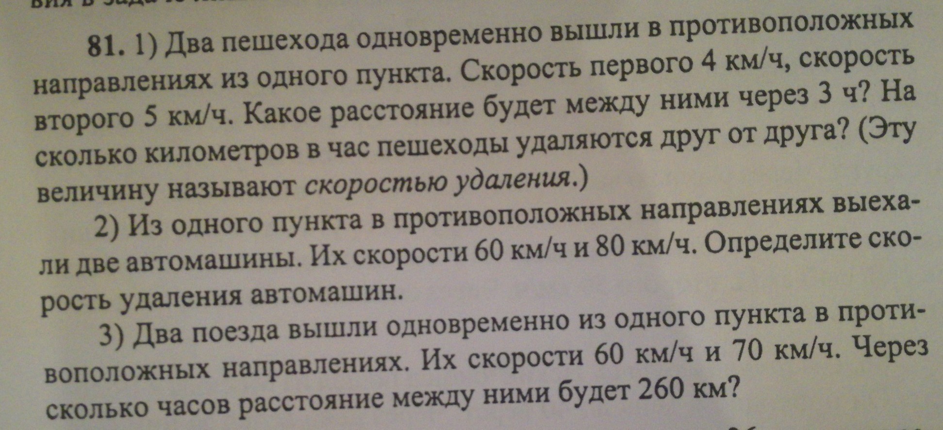 1) 4+5=9км - удаляются друг от друга за 1 час