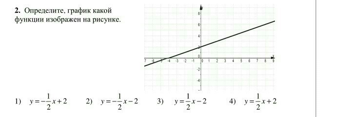 График возрастающей линейной функции, потому что k=1/2>0, график проходит через точку, ордината которой у=2. Ответ 4).
