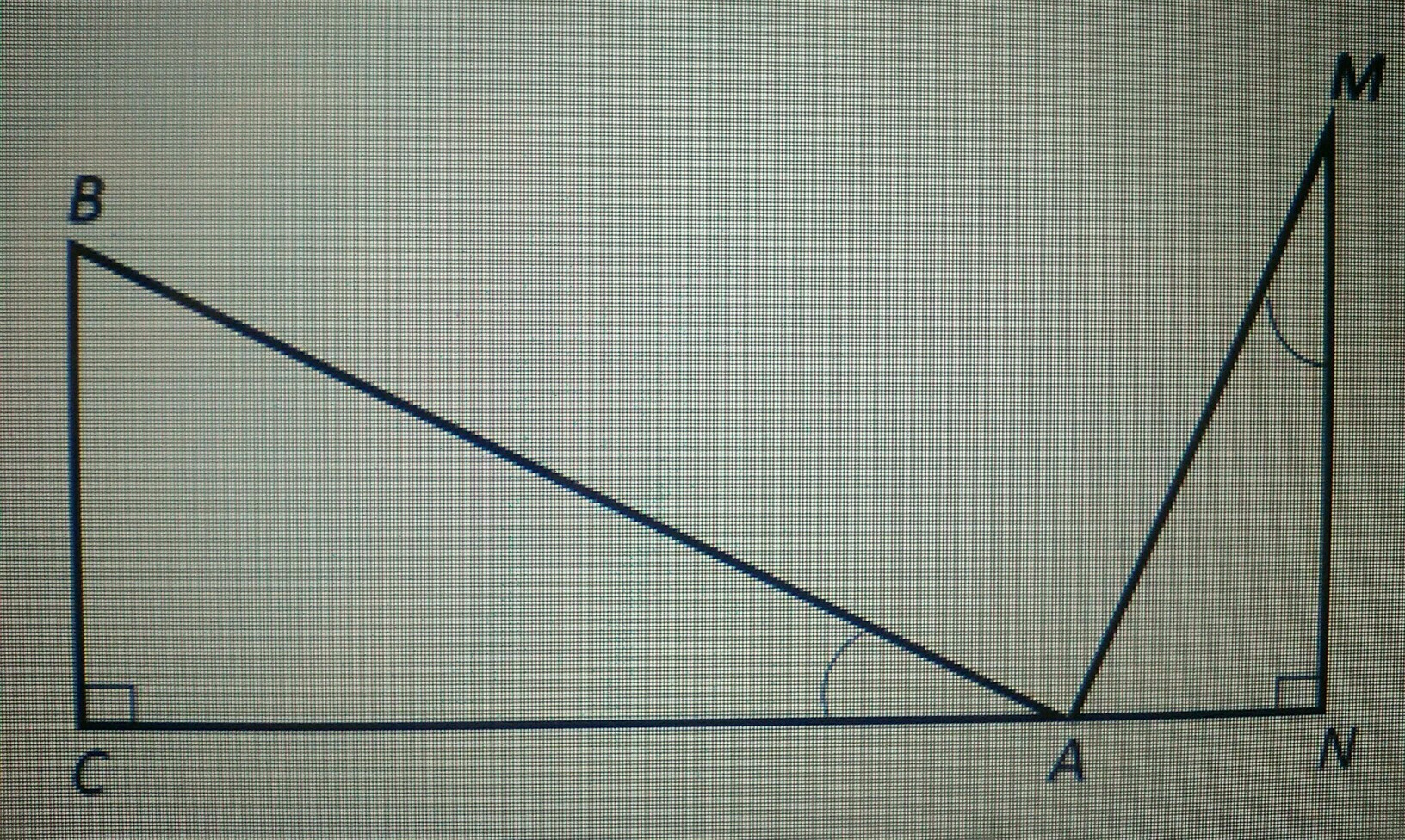 На рисунке изображены два треугольника ΔABC и ΔMAN , причем угол ∠BAC = ∠AMN, ∠C =∠N = 90(градусов)