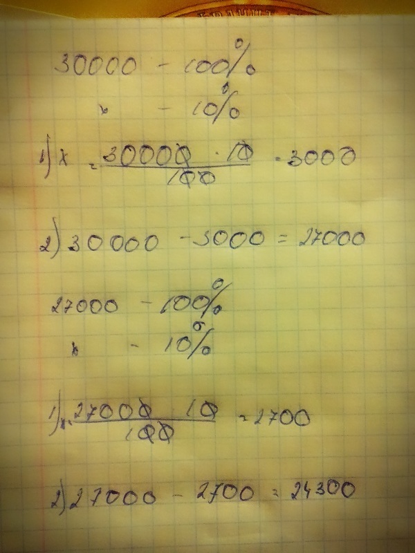 Сапоги стоили 30 000тг.Цена на них последовательно пониждалась 2 раза на 10%.Какой стала цена сапог после второго понижения?