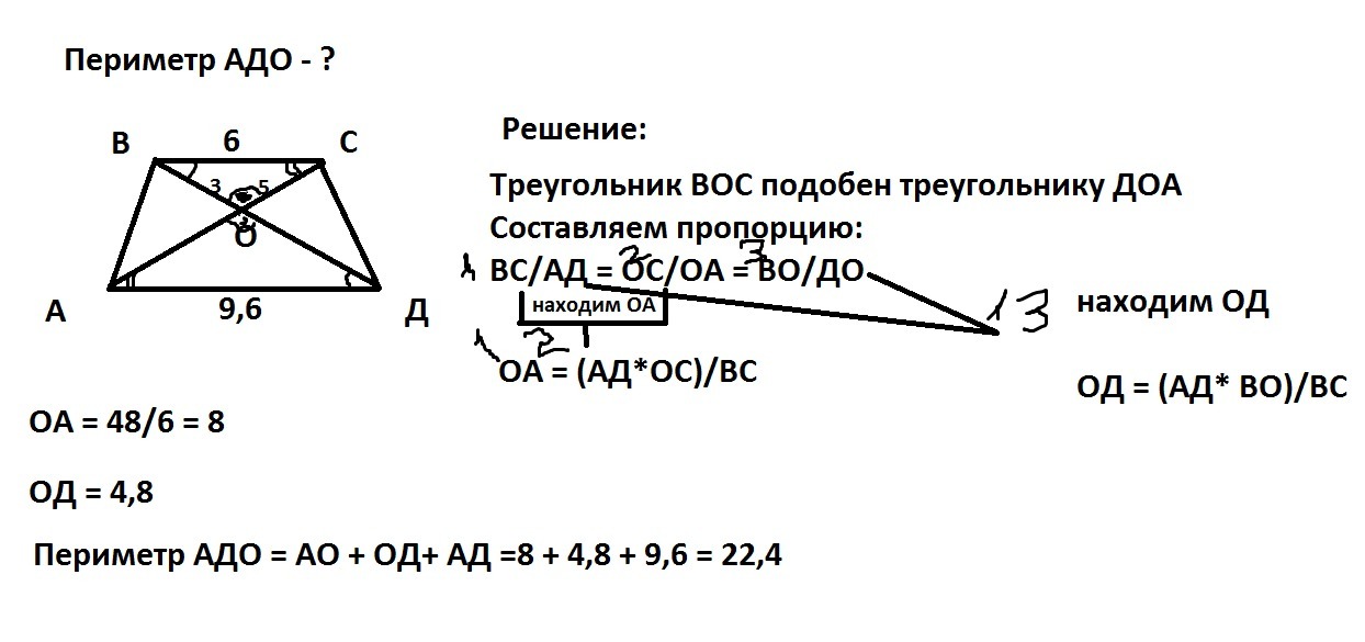 Дана трапецияABCD , диагонали которой пересекаются в точкеО. Найдите периметр треугольникаADO , еслиOC = 4 ,BO = 2 , основанияBC = 5 ,