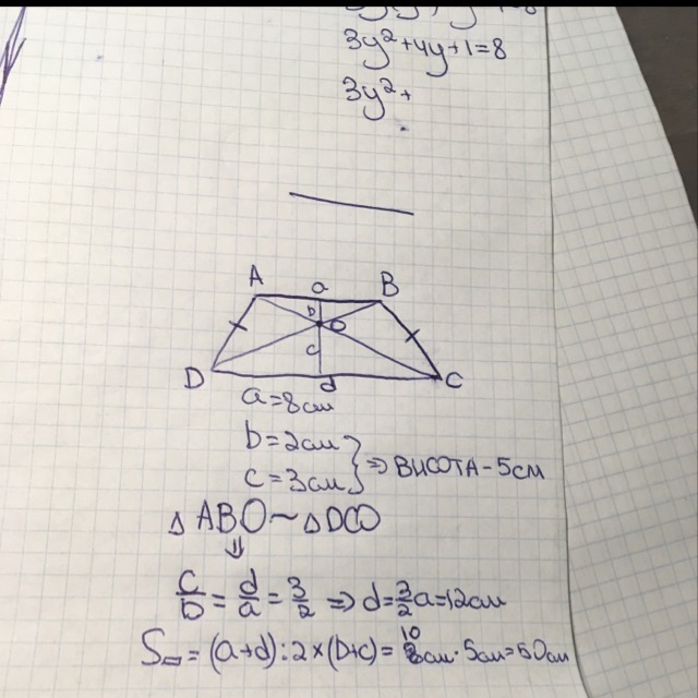 Менша основа рівнобічної трапеції дорівнює 8 см. Точка перетину діагоналей трапецї віддалена від основ на 2 см і 3 см. Знайдіть площу трапецї.